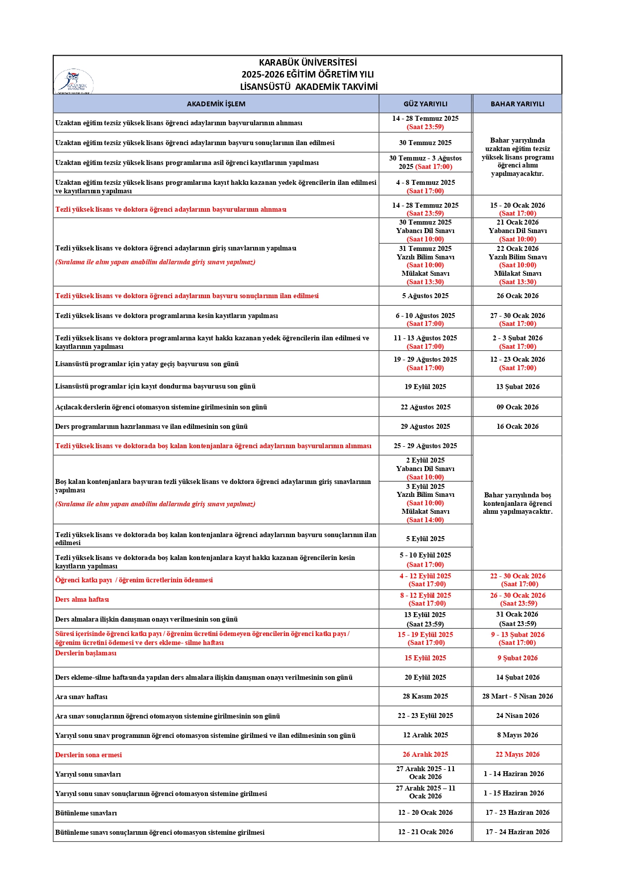 KARABÜK ÜNİVERSİTESİ LİSANSÜSTÜ EĞİTİM ENSTİTÜSÜ 2025-2026 AKADEMİK SÜREÇ TAKVİMİ